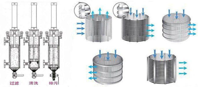 液體從殼體進液口進入,介質(zhì)通過楔形網(wǎng)濾網(wǎng),粗顆粒被濾網(wǎng)攔截,高濃度的液體,順著濾網(wǎng)慢慢堆積,聚集在設備底部,壓差傳感器檢測濾芯內(nèi)外壓差值,控制模塊啟動清洗程序,刮刀將附著在濾網(wǎng)內(nèi)外壁的介質(zhì)清洗,并隨著底部的濃縮液排出殼體,恢復正常過濾狀態(tài)。